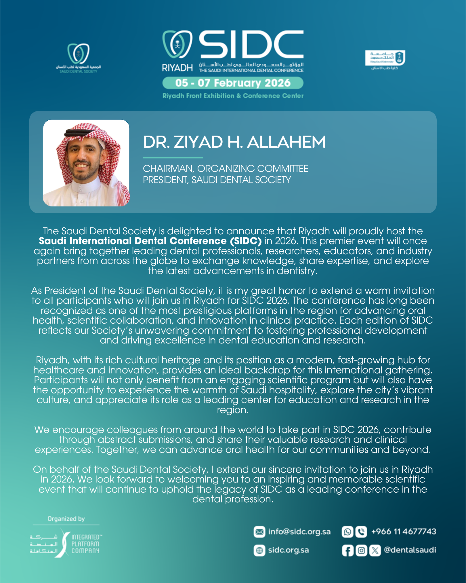 The 37th edition of the Saudi International Dental Conference is a premier occasion intended for dental professionals, experts and leaders providing international forum addressing key topics in various specialties in the dental field.